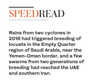 Rains from two cyclones in 2018 had triggered breeding of locusts in the Empty Quarter region of Saudi Arabia, near the Yemen-Oman border, and a few swarms from two generations of breeding had reached the UAE and southern Iran.