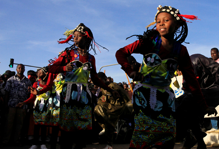 Members of a traditional Sudanese band perform during a sit-in protest outside the Defense Ministry in Khartoum on April 15, 2019. (REUTERS/Mohamed Nureldin Abdallah)
