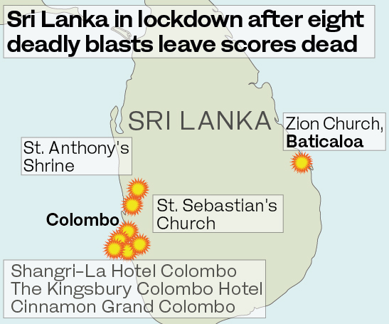 There were similar scenes of carnage at two churches in or near Colombo, and a third church in the northeast town of Batticaloa, where worshippers had gathered for Easter Sunday services. Pictures from the scene showed bodies on the ground and blood-spattered pews and statues.
