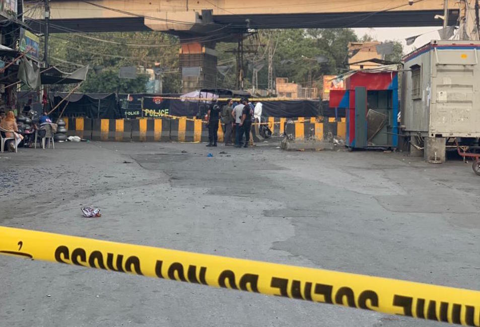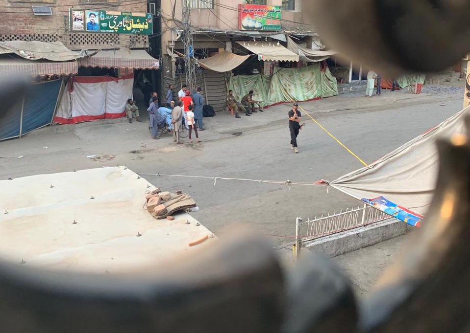 Seen from the balconies of the Data Darbar shrine, a police cordon below guards the site of a suicide bombing that targeted a police van on May 8, 2019. (AN photo by Amal Khan)