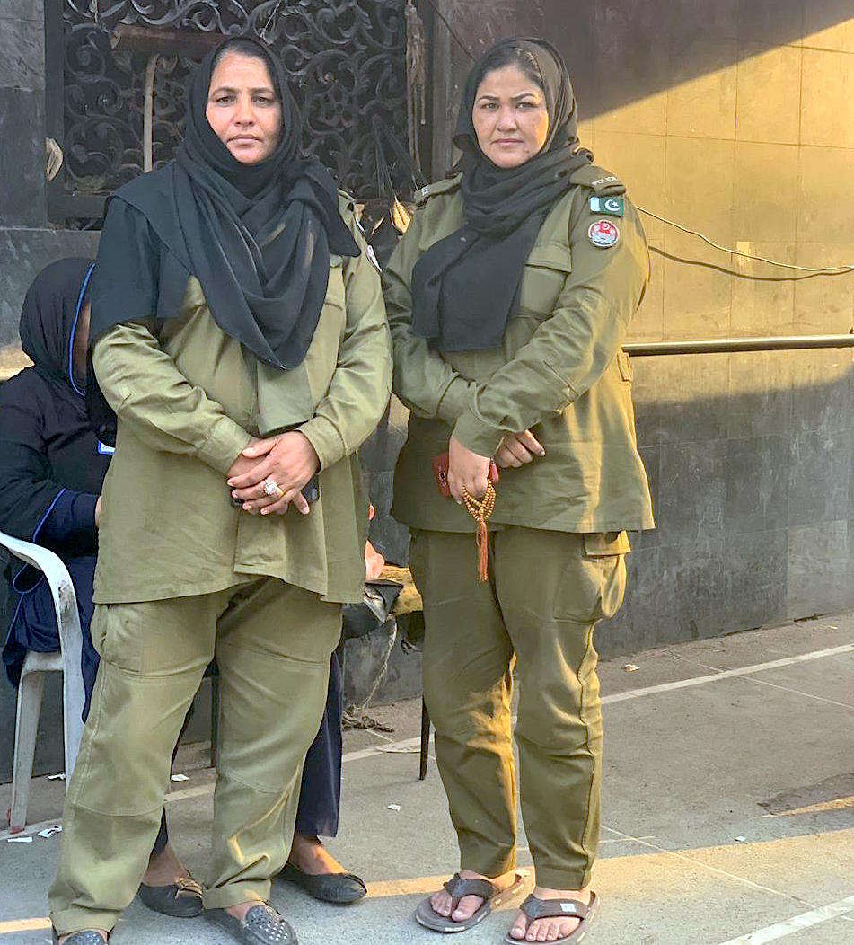 Two police constables stand guard at the women’s entrance of the Data Darbar shrine close to where a suicide bombing killed at least ten people, four of them policemen on May 8, 2019. (AN photo by Amal Khan)