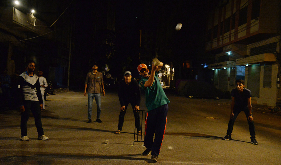 Halogen bulbs are tied to coat hangers and hung up on trees and power cables to provide extra lighting on dimly lit streets. Bricks are used to mark where the pitch begins and ends and crates of Coca Cola are stacked one on top of the other to form the wicket. One boy has already collected tiny donations, a dollar or less, from kids and adults in the street who want to participate in this year’s tournament. The rules of the game, too, are adapted for the street and the players are all locals to the area, arriving in shorts and tee-shirts and flip flops to play a game that will tide them over through the night until sehri, the pre-dawn meal eaten just before sunrise. After that, Muslims fast throughout the day, abstaining from food and drink, until sunset when an iftar meal is served. After tarawih, or late night prayers, the kids come out to play once more.