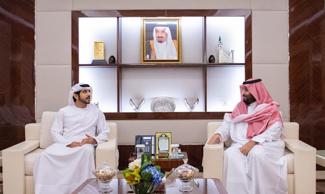 JEDDAH: Saudi Crown Prince Mohammed bin Salman and Sheikh Hamdan bin Mohammed bin Rashid Al Maktoum, crown prince of Dubai, met on Sunday to review the "brotherly historical relations" between the Kingdom and the United Arab Emirates, the Saudi Press Agency reported.