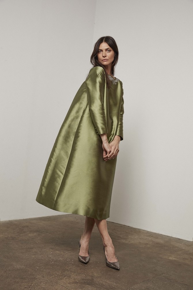 The sophisticated line features oversized, puffed silhouettes and is based on a demure color palette of creams and various shades of green, with a pale mauve and steel blue also making an appearance.