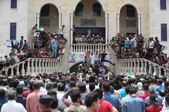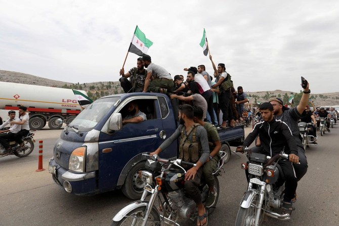 People chanted, honked and waved rebel flags on the way to the funeral in the border town of Al-Dana, where one of Sarout’s brothers is buried.