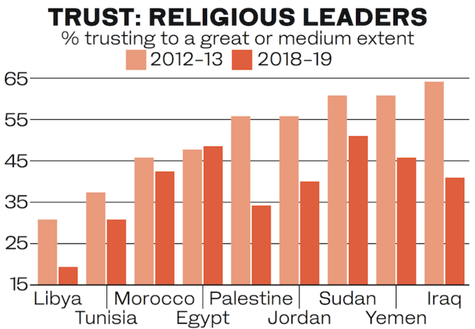 Trust in religious leaders in Palestine has also declined significantly — by 22 percent since 2012.
