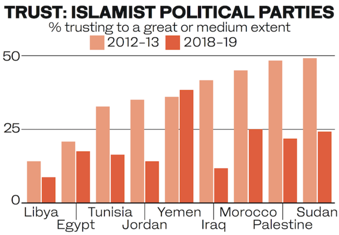 “This pattern continues a general trend of decline in trust for Islamists in MENA, which has been taking place across the region since the Arab uprisings,” the Big BBC News Arabic Survey 2018/2019 said.