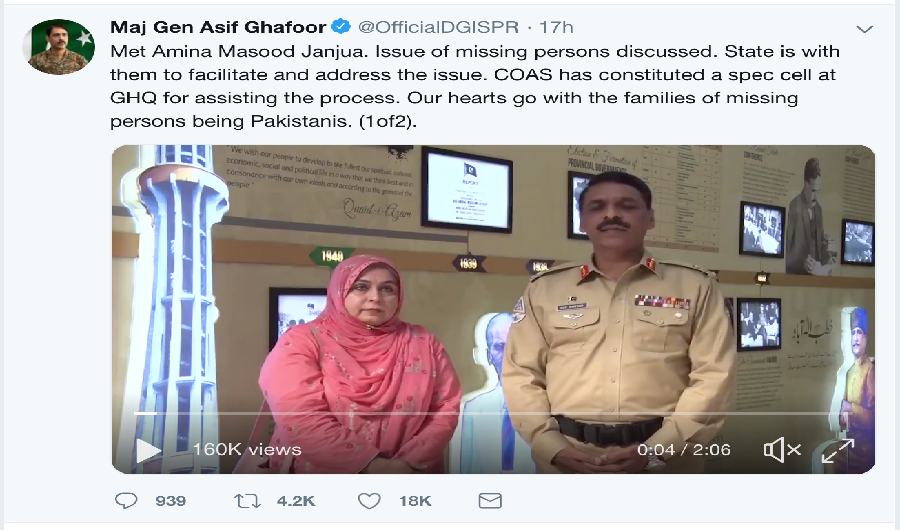 “Met Amina Masood Janjua. Issue of missing persons discussed,” army spokesman Maj Gen Asif Ghafoor said in a Twitter post. “State is with them to facilitate and address the issue. COAS [chief of army staff] has constituted a spec cell at GHQ [general headquarters] for assisting the process. Our hearts go with the families of missing persons.”