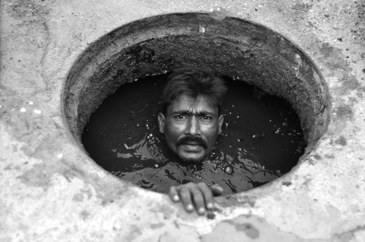 A few years ago during a street-photography assignment in Karachi I noticed a rod sticking out of the grimy water of a manhole. When I went closer I saw that a man was completely immersed inside the dark hole cleaning the gutter. That was such a haunting sight.