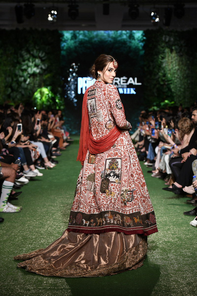 On the first night of PLBW19 Nida Azwer's bridal collection includes a dupatta drape not commonly seen in women's collections. (Photo courtesy: Faisal Farooqui, Dragonfly)