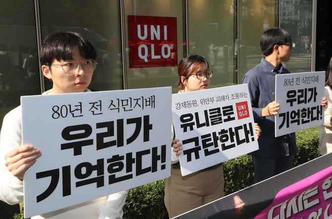 The phrase “Uniqlo, comfort women,” in reference to women forced to become sex slaves to Japanese troops during the Second World War, was among the most searched terms on Naver at the weekend, and demonstrators protested outside Uniqlo shops on Monday.