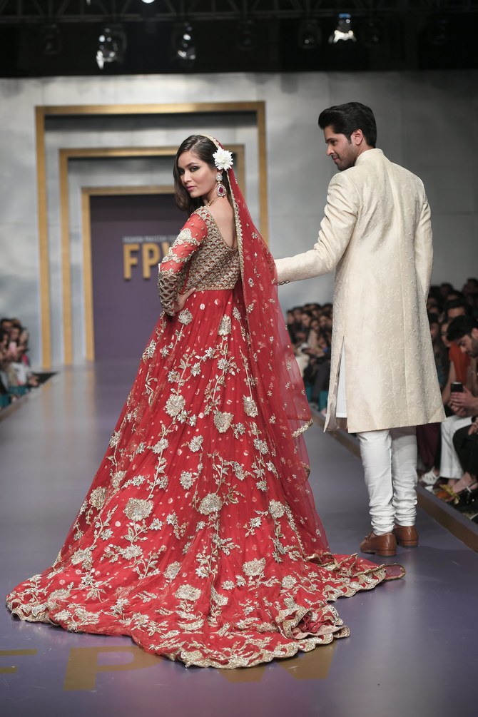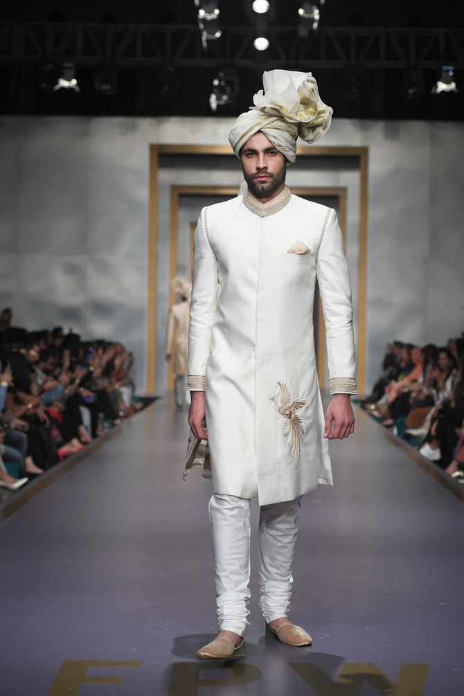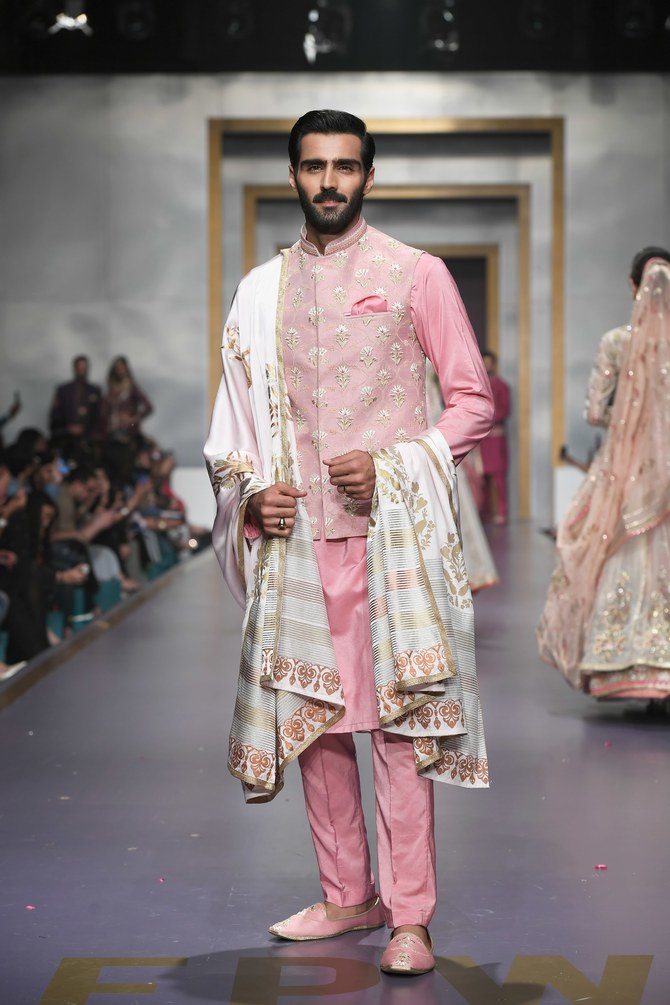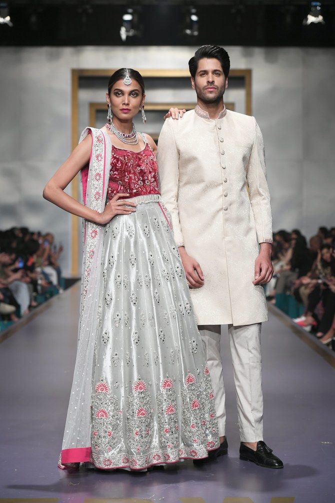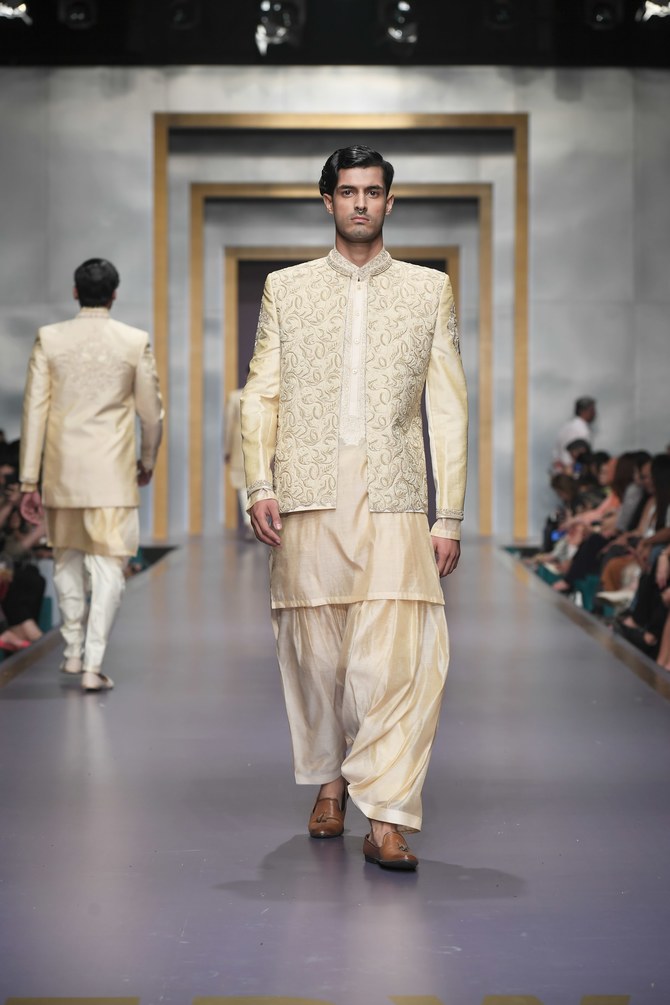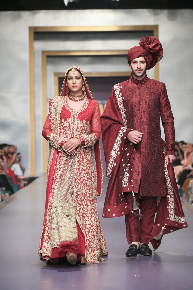 Nauman Arfeen, one of the few designers who creates clothes for both brides and grooms, presented ‘Uraan,’ a classic, unfussy collection elevated by its fine detailing. There was a burgundy sherwani with deep, dark red embroideries across it and a muslin colored three-piece ensemble featuring a wide leg shalwar and short jacket. Arfeen’s collection illustrated the story of a man learning to let go of his son as he is about to be married, a theme that is usually reserved for the other gender and one not often seen on the fashion ramp!