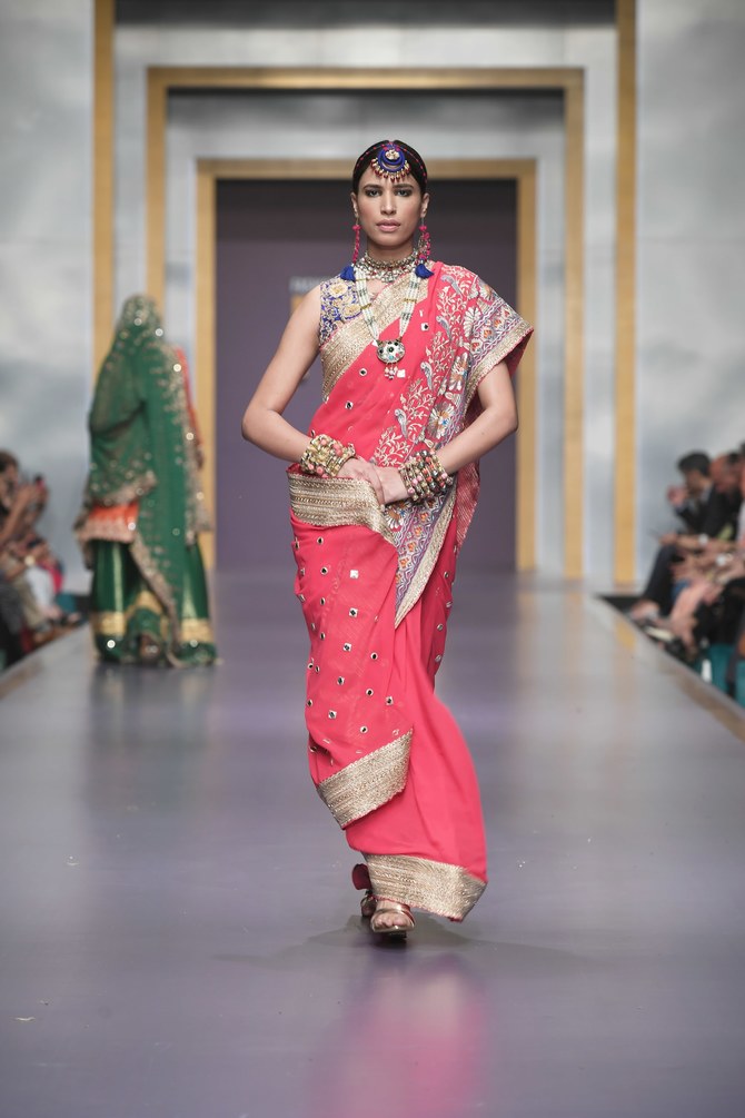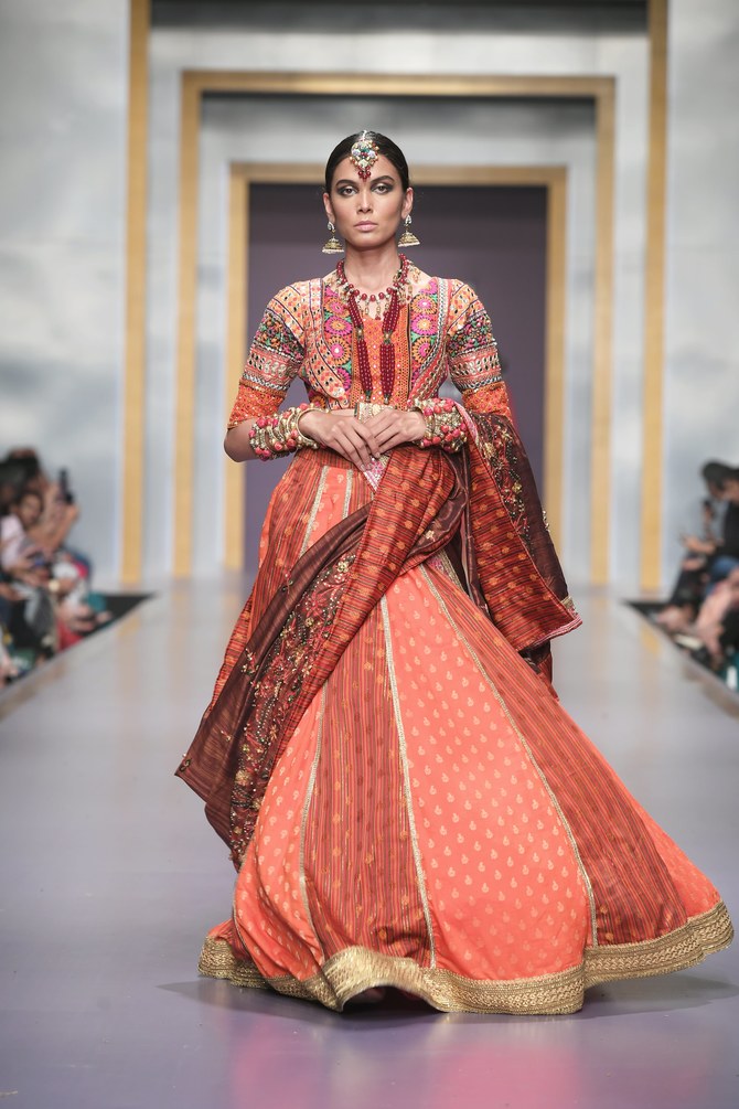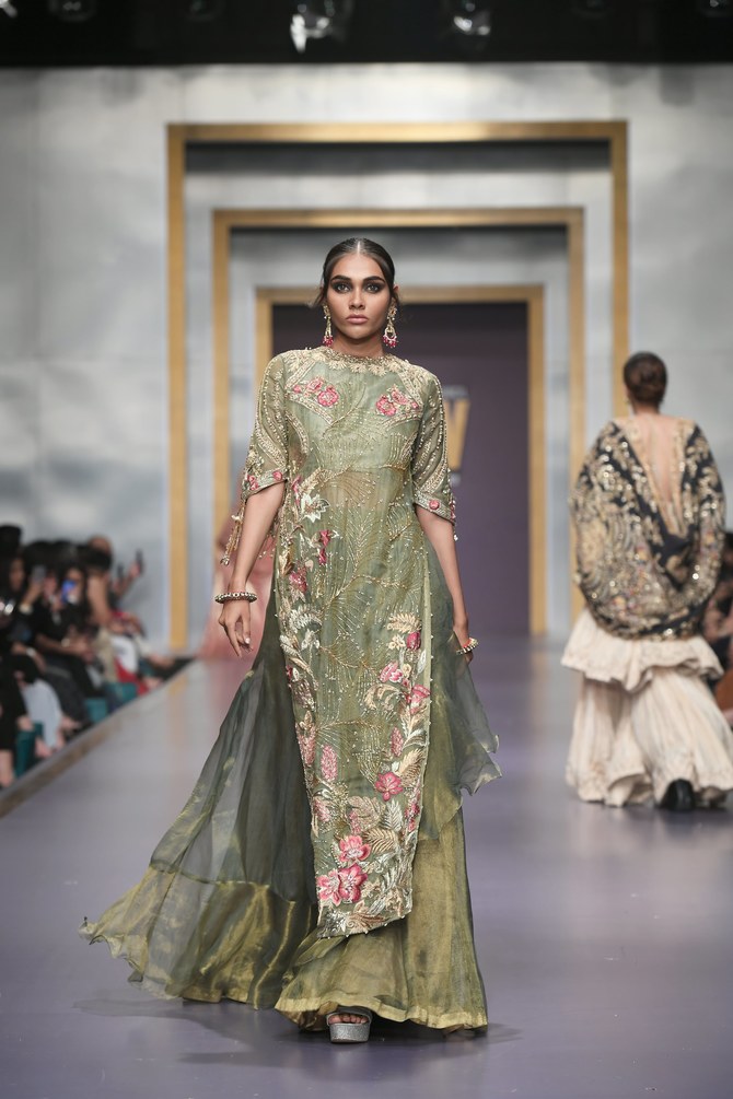 “Adam and Eve” by Sadaf Fawad Khan was a pretty, albeit expected, take on bridal wear, and featured some more tried and tested bridal options like long shirts paired with lehengas, lehenga cholis with sheer detailing and gowns. A rosy hued, floral ensemble opened the show, and the collection gave its nod to trending colours and craftsmanship across the FPW ramp.