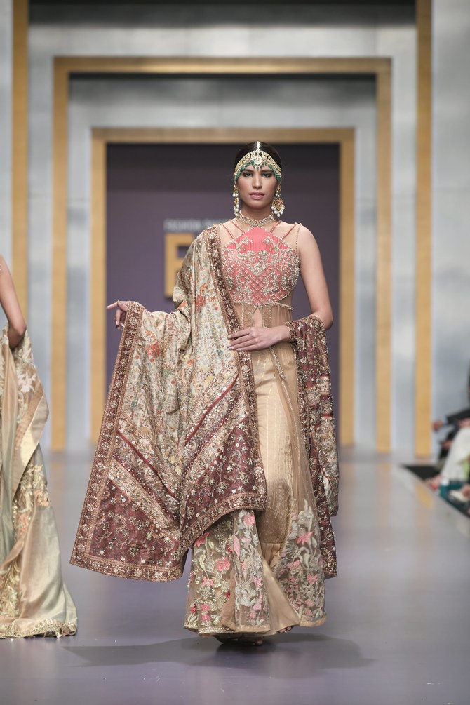 By the designer’s own admission, ‘Talea’ by Shiza Hasan was designed for the “regal yet enthralling bride with a smile on her face.” Though bridal in nature, the collection brought some stylistic uniqueness into the mix by playing with cuts and styles not often associated with bridals, including a standout gold look with asymmetrical straps, sheer cross-over panels and culottes. The collection was a celebration of fuchsia, peaches, deep reds and multiple shades of garnet.
