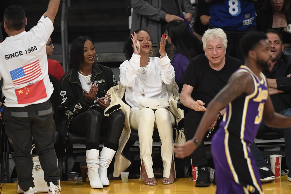 Rihanna sat courtside at a basketball game between the Los Angeles Lakers and the Utah Jazz at the Staples Center on Oct. 25 and showed off a casual all-white ensemble accessorized with layered necklaces, chunky hoop earrings and sandals by Amina Muaddi.