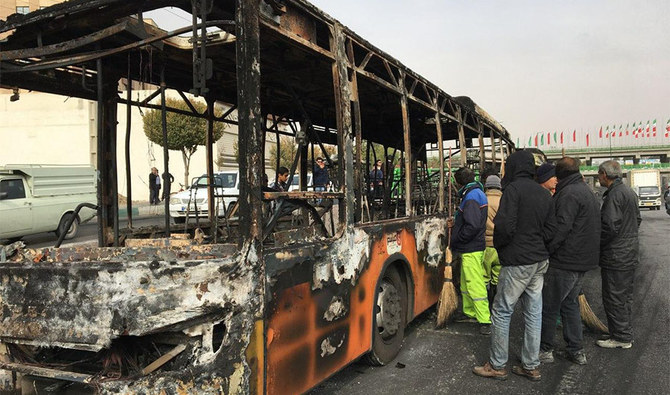 Iranians inspect the wreckage of a bus that was set ablaze by protesters during a demonstration against a rise in gasoline prices in the central city of Isfahan on November 17, 2019. (AFP)