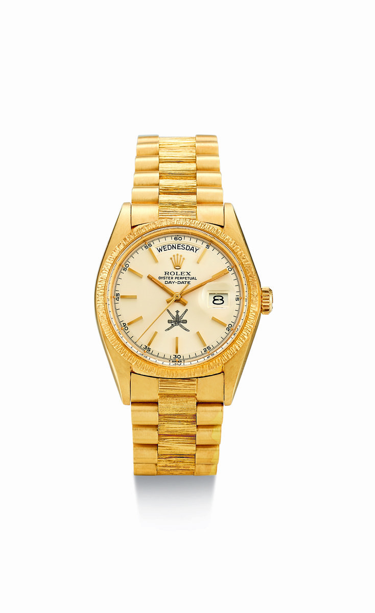 A yellow gold Rolex wristwatch commissioned by the sultanate of Oman in the early 1970s. Supplied