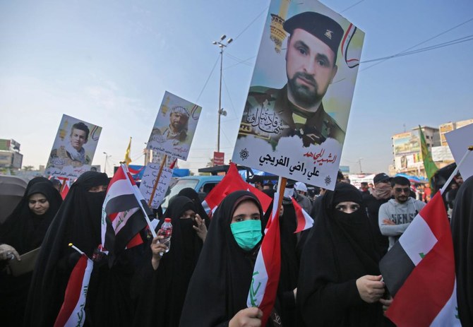 Some carried portraits of Hashed fighters killed in fighting against extremists as well as pictures of the country’s top Shiite cleric, Grand Ayatollah Ali Sistani.