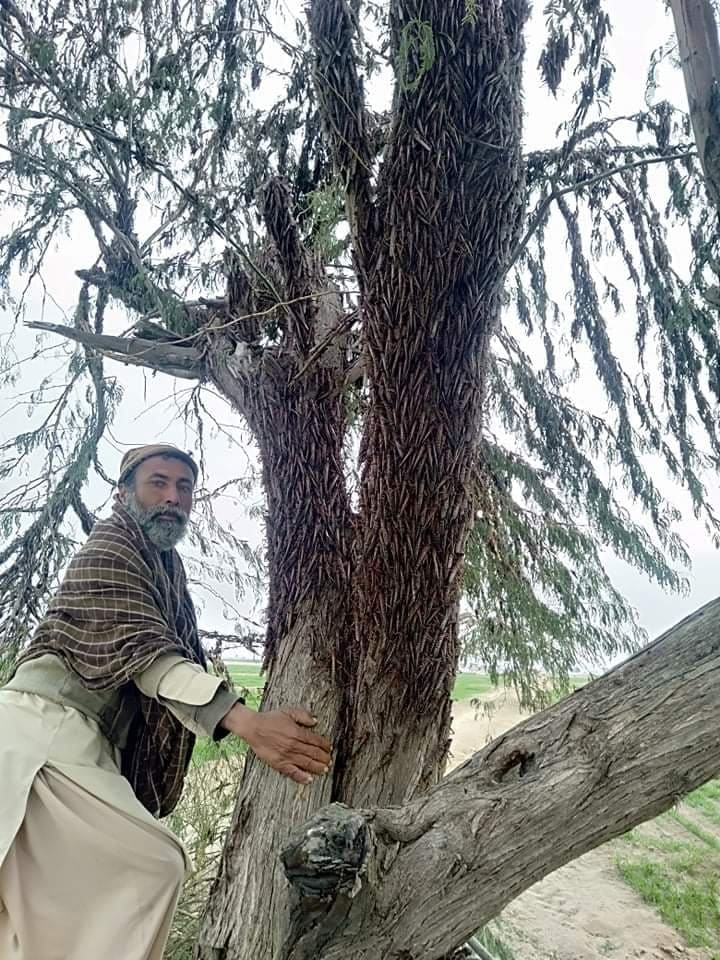 A man poses for a photo with a locust-covered tree in Kerri Shamozai on the outskirts of Dera Ismail Khan, Jan. 20, 2020. (AN photo)