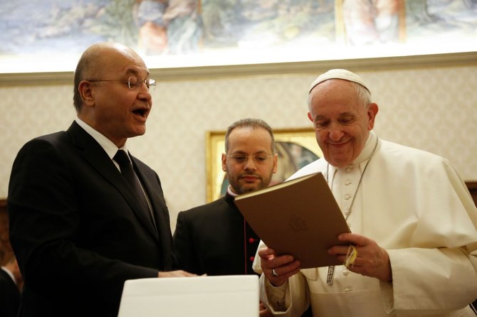 - President Barham Salih held private talks for about 30 minutes with the pope and then met the Vatican’s two top diplomats