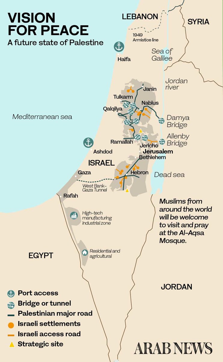 Trump proposed a Palestinian state double the size of the existing Palestinian territories, with East Jerusalem as its capital and a US Embassy there; high-speed rail links between Palestinian areas and a tunnel linking the West Bank and Gaza; a four-year ban on Israeli settlement building on land earmarked for a Palestinian state; $50 billion in economic aid; and continued oversight by Jordan of Al-Aqsa mosque compound.