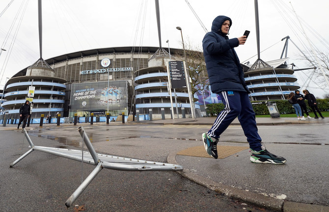 A fan walks outside the Etihad Stadium during storm Ciara after the Manchester City v. West Ham United Premier League game was postponed. (Reuters)