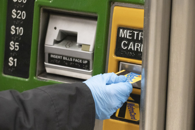 A woman wears a protective glove as she purchases a metro card at a subway station, Wednesday, March 4, 2020, in New York. (AP)