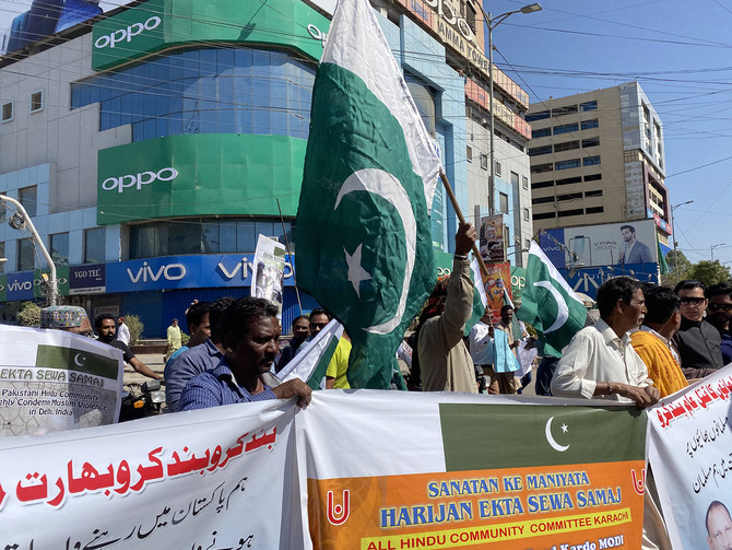 KARACHI: Representatives of Pakistan’s Hindu community on Sunday marched in support of the Muslims of Delhi affected by violent riots in the Indian capital last month, and announced they would celebrate this year’s Holi festival on Monday with sobriety as a message of protest against the violence in India.