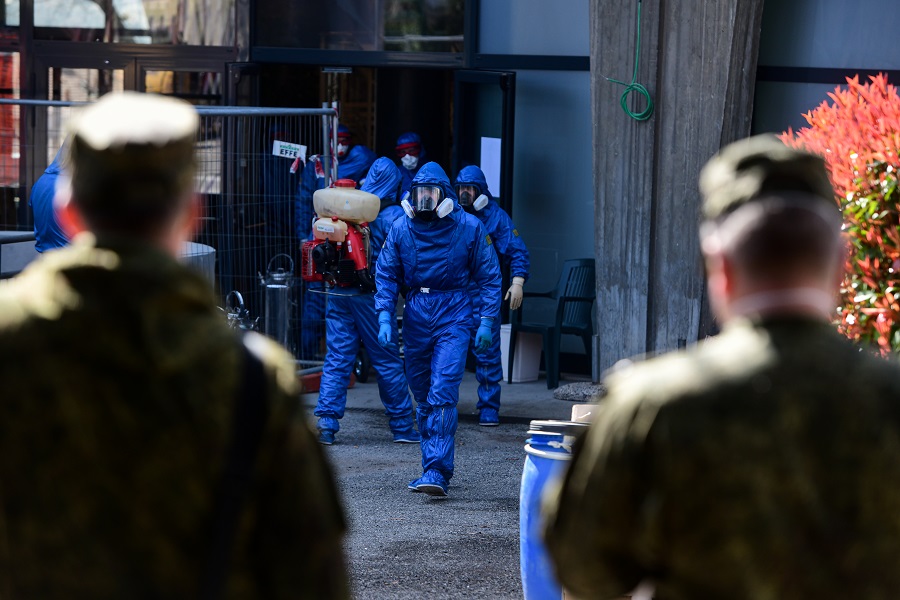 A Russian Army specialist walks outside the Honegger nursing home where 35 people have died so far from coronavirus in Albino, Italy, on March 28, 2020, amid the spread of the COVID-19 (new coronavirus) pandemic. (AFP)