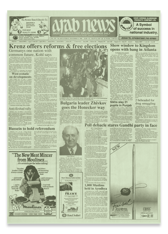 On Nov. 11, 1989, no such insular myopia afflicted Arab News, which devoted a large chunk of its front page to events in Germany — “a far away country,” certainly, but one where the Cold War played out every day in a single city, with profound implications for the Middle East and the whole world.