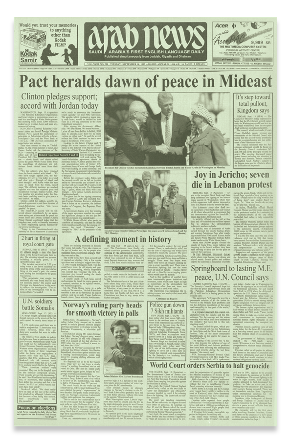 A page from the Arab News archive showig the news on Sept. 14, 1993.