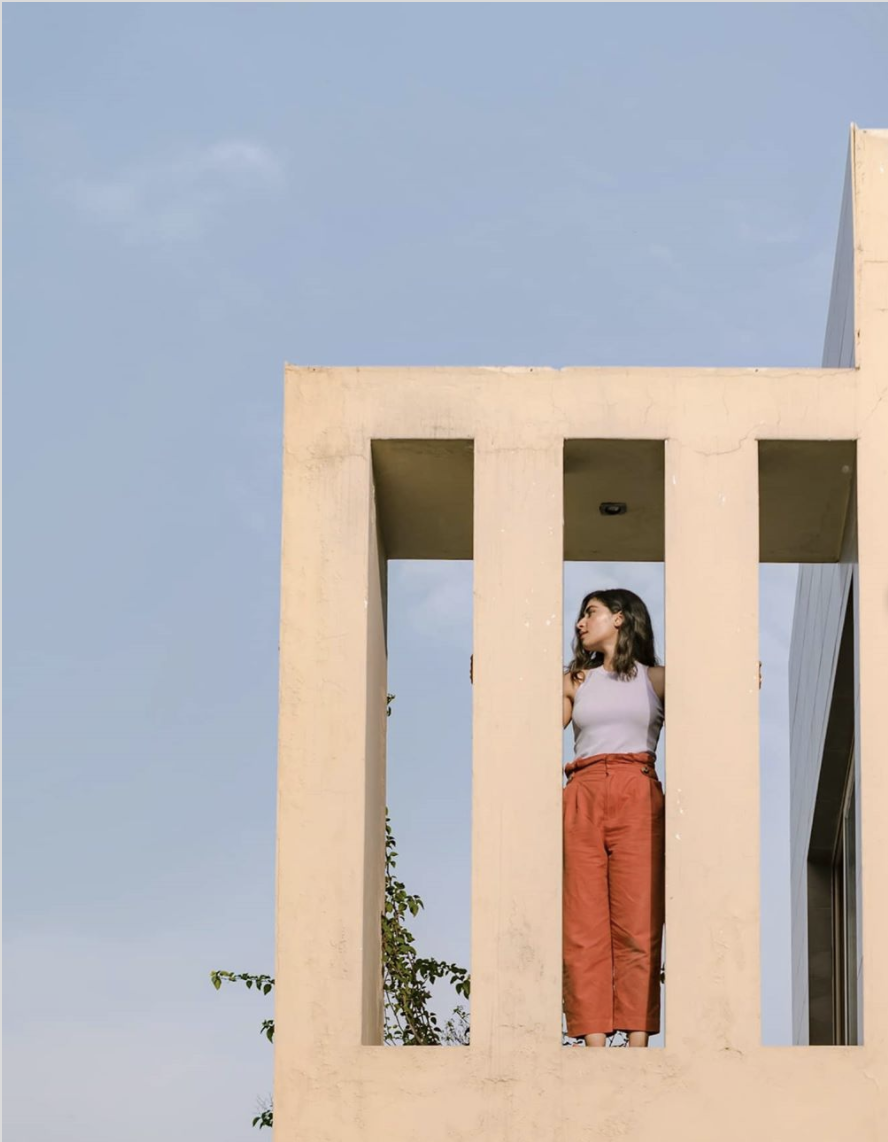 Stylist Mehek Saeed is photographed from the safe distance of her balcony by Areesh Zubair who came up with the idea of far-away portraiture to respect social distancing while documenting this moment in history. (Photo courtesy: Areesh Zubair Instagram)