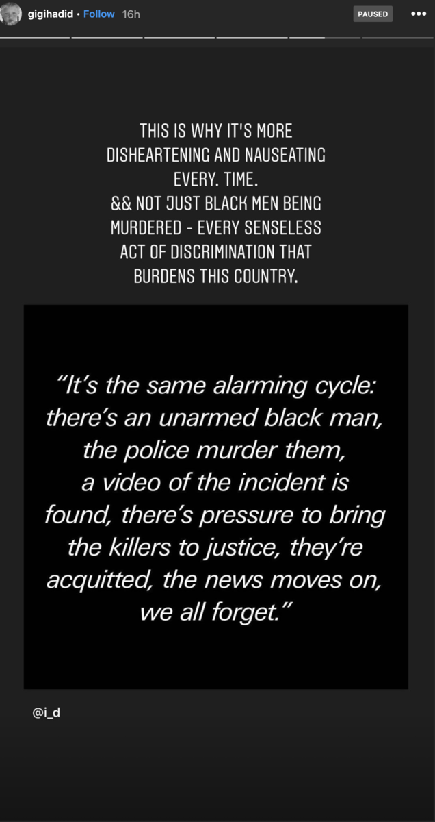 Her sister, Gigi Hadid, also spoke up about the viral video on her Instagram account. “This is why it is more disheartening and nauseating every time. And not just black men – every senseless act of discrimination that burdens this country,” she wrote to her 54.2 million followers.