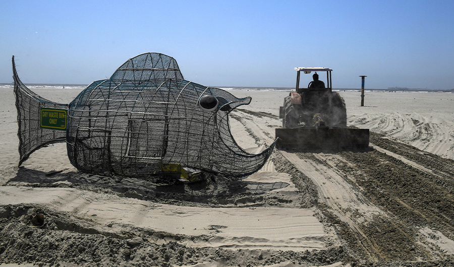 A Cantonment Board Clifton (CBC) worker takes part in a cleanup of Clifton Beach as he drives by a fish-shaped bin for dry waste in Karachi on Sept. 19, 2019. (AFP/File)