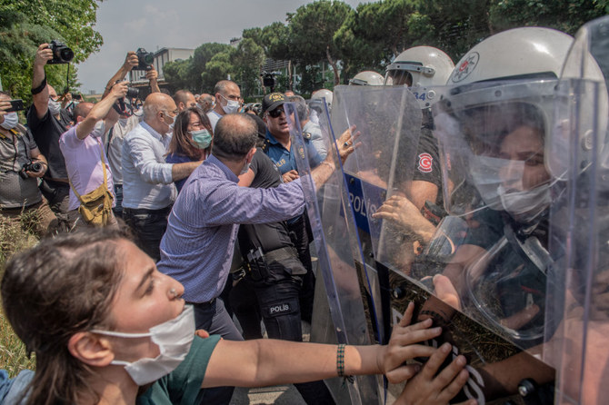 Demonstrators clash with Turkish riot police during a "March for Democracy" called by Kurdish People's Democratic Party (HDP) in Istanbul on June 15, 2020. (Photo by BULENT KILIC / AFP)