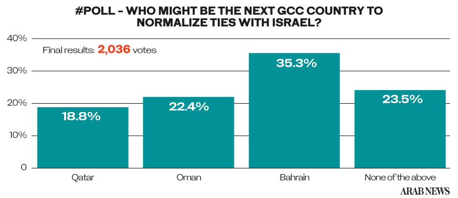 DUBAI: One third of respondents to an Arab News social media poll say they believe Bahrain will follow the UAE in normalizing relations with Israel.