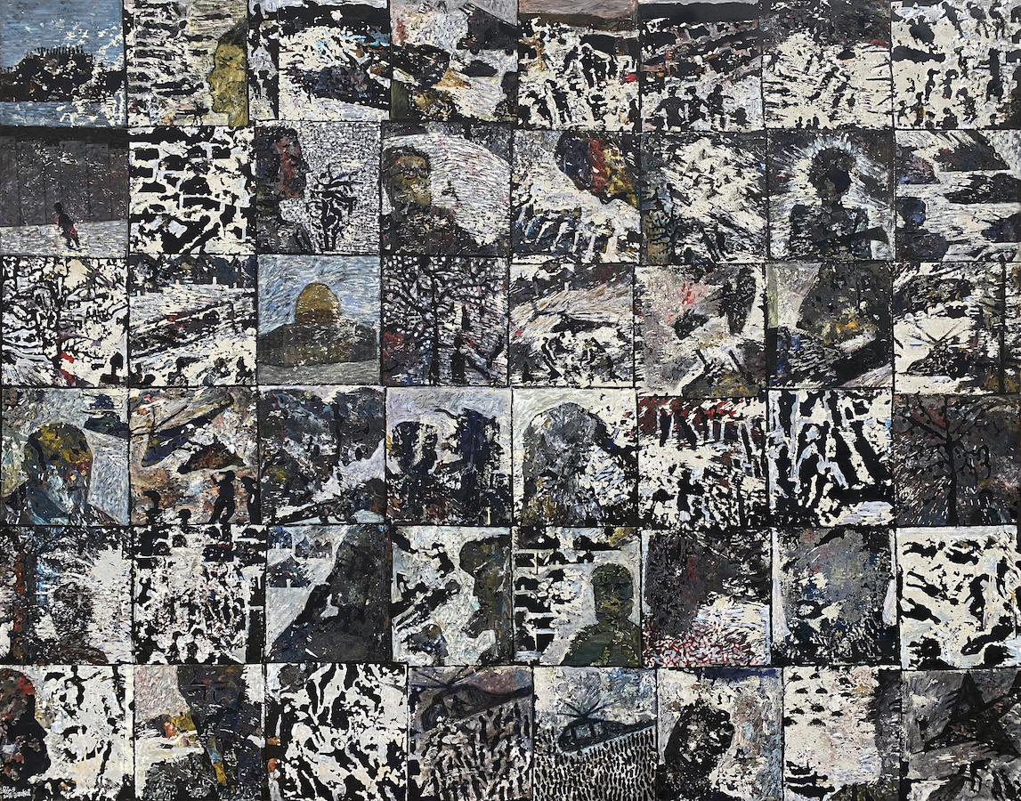 One of two works from this series of Barakat’s that feature in the exhibition. The Gaza-born, Ramallah-based artist is one of the most prolific in Palestine, and has said the dark colors that dominate his work “reflect the hardships of our time and our present life.” His abstract “Light in the Dark” works “tell the story of people in confinement yearning for freedom,” according to the brochure. Each consists of several windows featuring mainly black-and-white images and depicting a different detail of life under occupation. “One can notice a competition between the black and the white, a fight for domination in each square, as if the artist is redeeming the ‘white’ from a well of lost memory (black) in an attempt at documentation for future generations.”