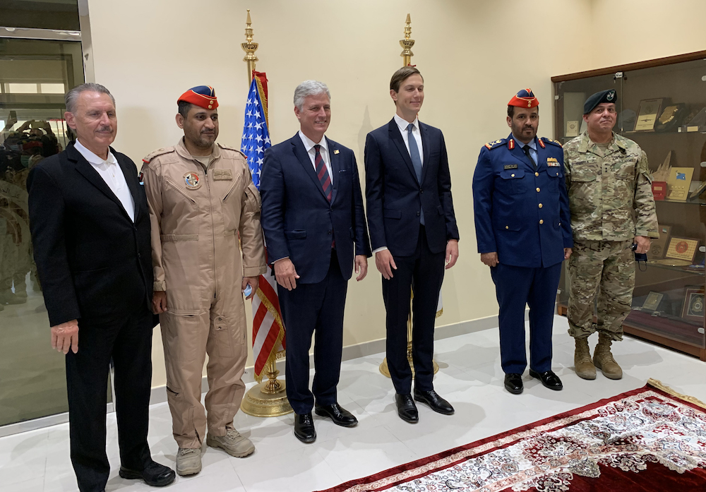 US Presidential Adviser Jared Kushner (C-R) and US National Security Adviser Robert O’Brien (C-L) pose for a picture with Emirati military officials after signing the text at the Al-Dhafra base, about 32 kilometres south of Abu Dhabi on September 1, 2020.