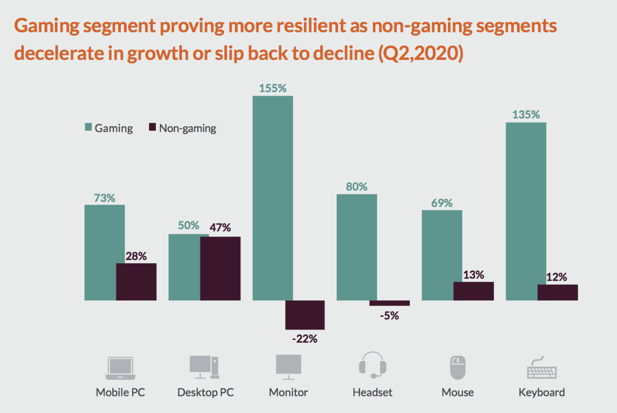 But the growth in gaming continues, with sales of devices such as gaming monitors growing by 155 percent while regular monitors decline by 22 percent. A similar trend can be seen across products such as notebooks, headsets and peripherals.