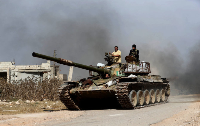 A Turkish military battle tank is seen along the M4 highway, which links the northern Syrian provinces of Aleppo and Latakia, in this March 15, 2020 file photo. (AFP)