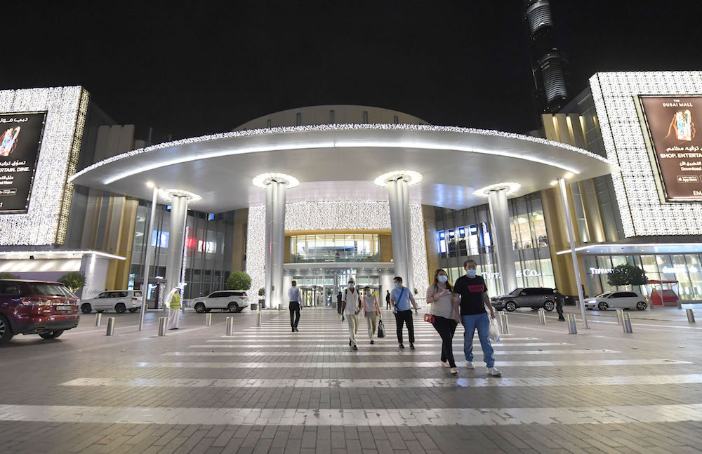 People wearing masks for protection against the coronavirus, leave the Mall of Dubai on April 28, 2020, after the shopping centre was reopened as part of moves in the emirate to ease lockdown restrictions imposed last month to prevent the spread of the COVID-19 illness. (AFP/File Photo)