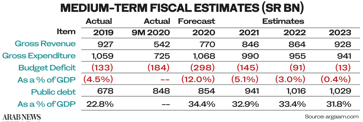 In its initial statement, the Ministry of Finance had estimated public revenue in 2021 budget at SR846 billion ($225 billion), and expenditures at SR990 billion, i.e. an expected deficit of SR145 billion.
