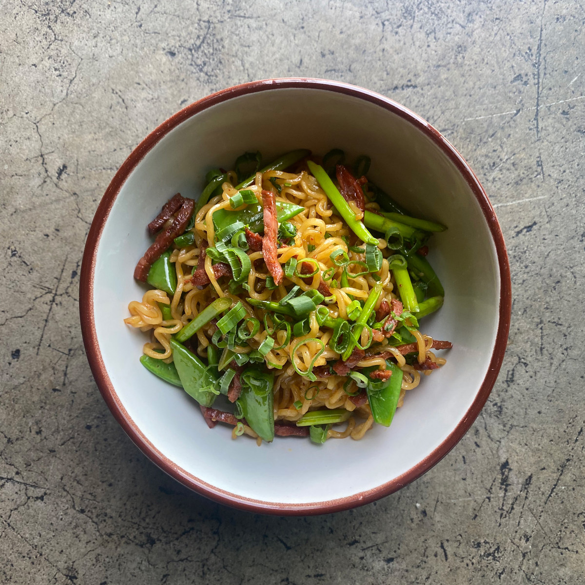 Served with crispy strips of meat and spring onions, it’s hard to believe that the dish is based around supermarket-bought instant noodles. (Supplied)