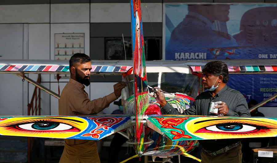"The world is familiar with our truck art representation; now, with this aircraft, our colours will fly in the air. We are really excited," Haider Ali, the artist painting the aircraft, told Reuters at the academy's hangar.
