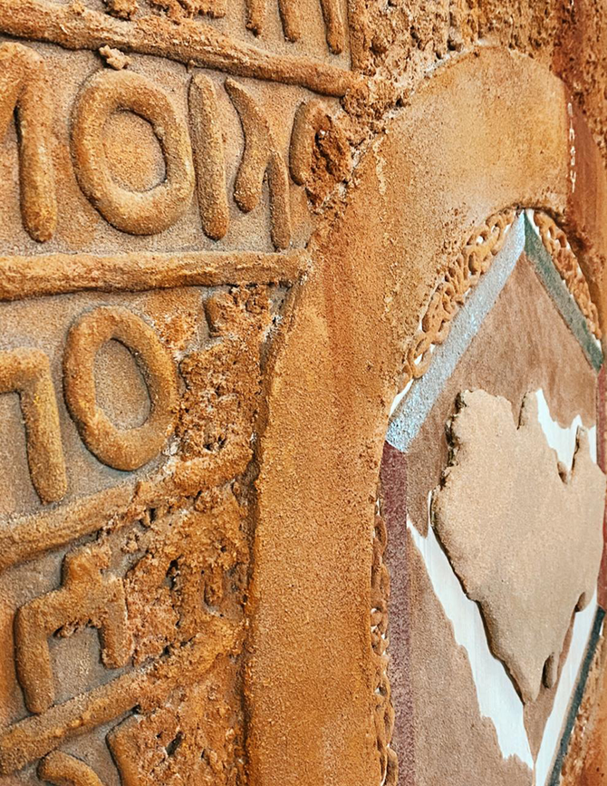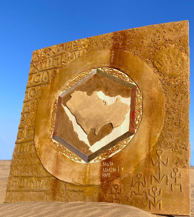 The GCC logo appears at the center of the piece surrounded by inscriptions resembling the rock art and carvings of the Lihyan civilization. Al-Balawi also added the summit’s title using the ancient south Arabian script Al-Musnad, found in the ruins of the Lihyan capital Dedan, which is modern-day AlUla.