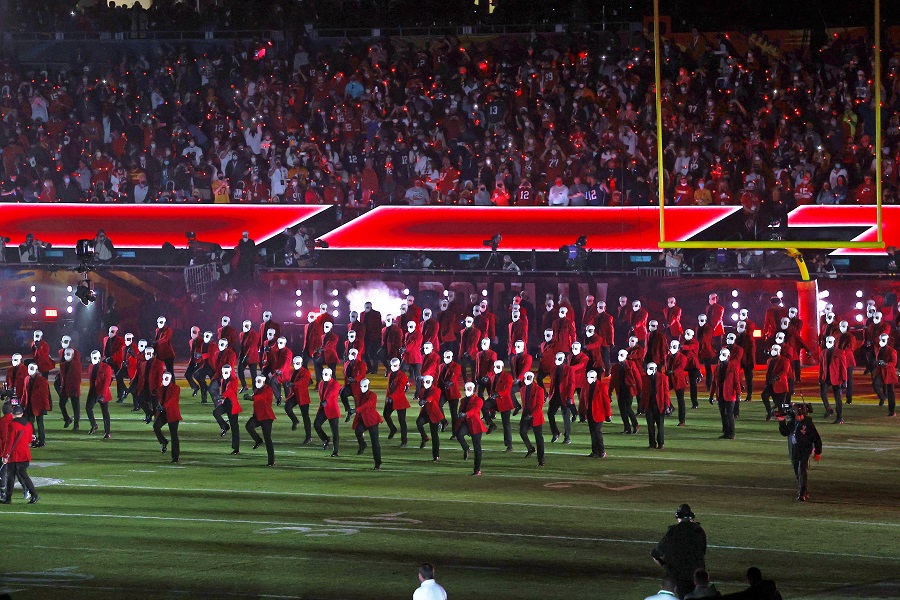 After other hits including “Earned It” and “Save Your Tears,” The Weeknd concluded the 13-minute show with his smash single “Blinding Lights,” a song that references “Sin City,” a nickname for Las Vegas. He performed the song on the field amid rows of his bandaged dancers.