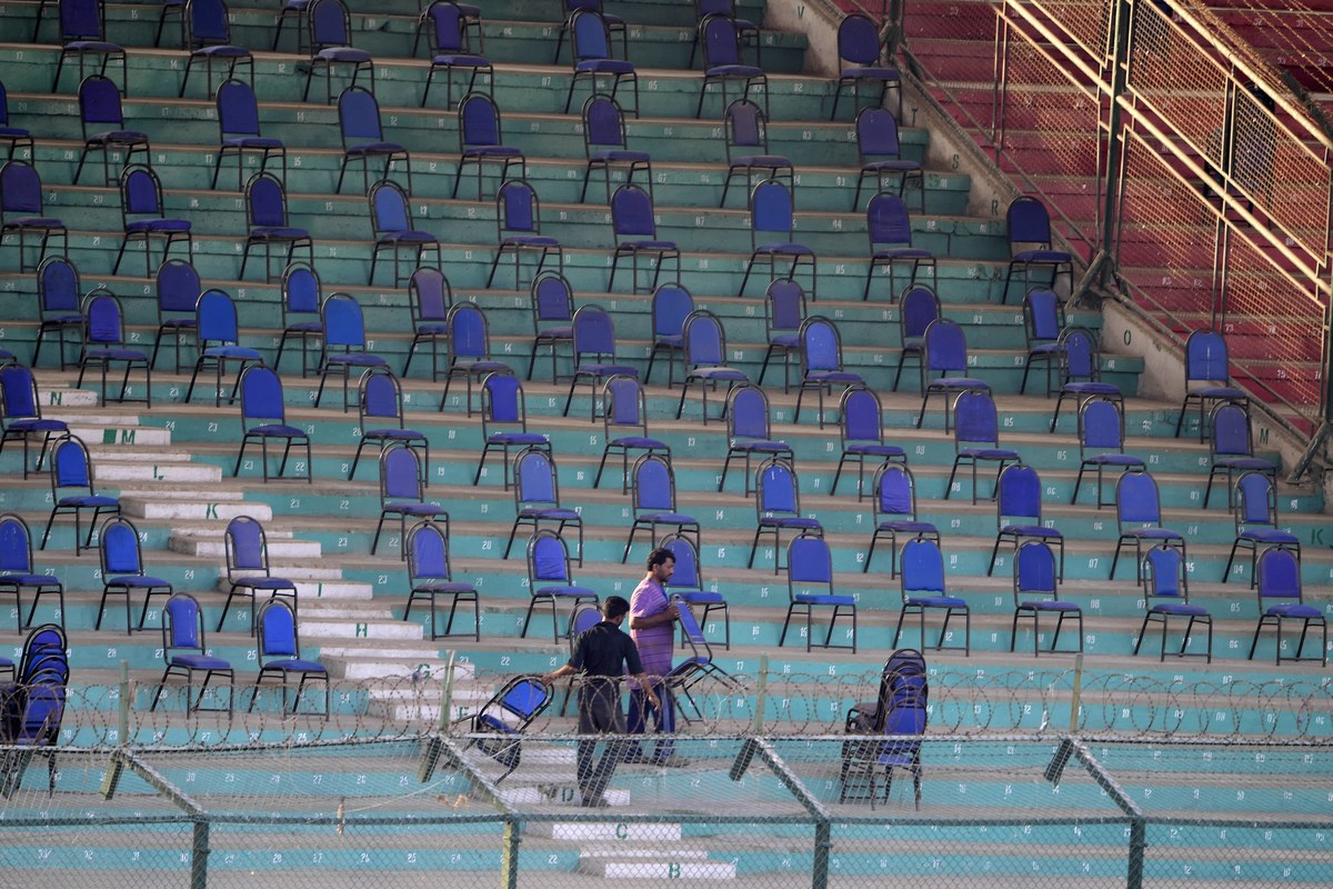 Ground staff members arrange chairs in the stands at the National Cricket Stadium in Karachi on February 18, 2021 ahead of the first T20 cricket match of the Pakistan Super League (PSL) on February 20 between the Karachi Kings and Quetta Gladiators. (AFP)