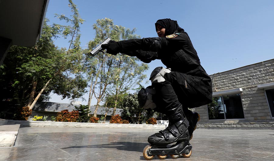 A Special Security Unit (SSU) police member holds up her weapon as she rollerblades during practice at the headquarters in Karachi, Pakistan February 18, 2021. Picture taken February 18, 2021. (Reuters)