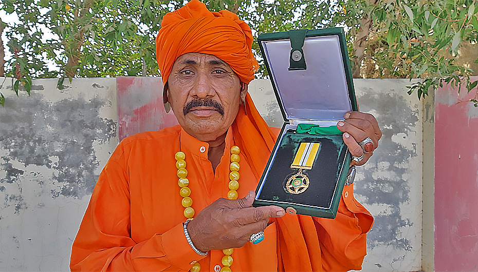 Chief of the snake charmers' community, Misri Jogi showcases the “Tamgha-e-Imtiaz” medal, conferred to him in 2013, in Umerkot, in the Thar desert region of Pakistan, on February 28, 2021. (AN photo by Zulfiqar Kunbhar)