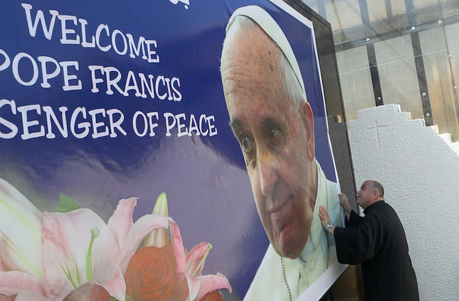 Father Nadhir Dako places a poster welcoming Pope Francis to St. Joseph's Chaldean Church in preparation for the Pope's visit, in Baghdad. (AP)